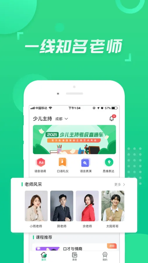 少儿主持,定位于“中国人的语商平台”。从儿童语商启蒙,拓展到所有对语言、对口才、对语商有需求的用户。其形式以线上1V1为主,兼顾直播大课,不仅包含自主研发的儿童标准课,还为语言、思维、礼仪等领域专家及线下培训机构提供销售渠道和在线辅导教学平台。
