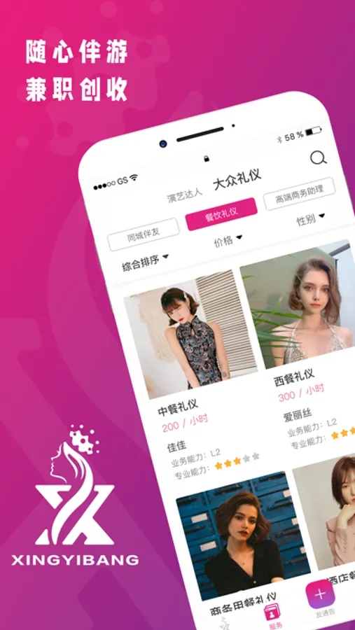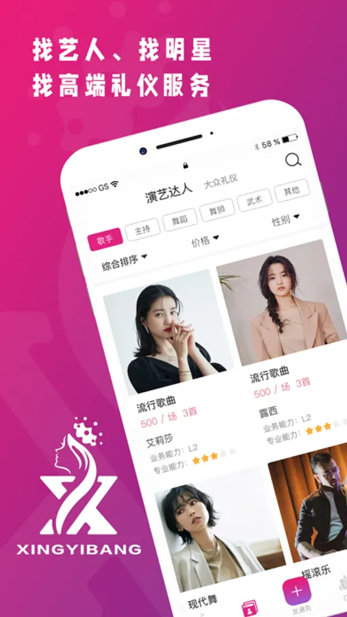 星艺帮是一款提供同城艺人礼仪服务的平台,支持顾客找艺人在线下单,和发布通告让艺人报名参加。拥有大批歌唱家、艺术家、舞蹈家等入驻。