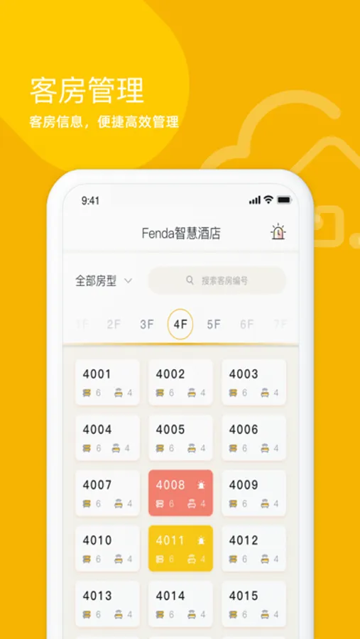 您可以轻松浏览酒店所有客房的信息,根据客房状态快速处理客房突发状况,实现便捷高效的管理。