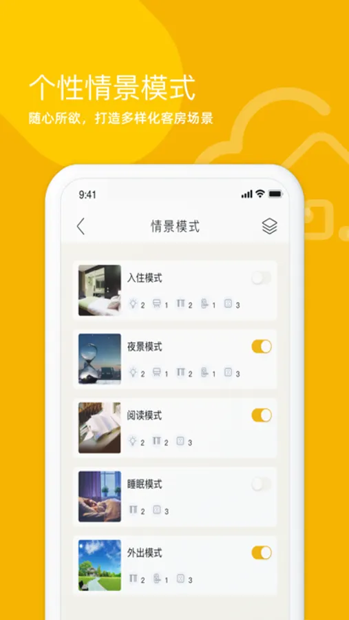 您可以打造专属于客房的情景模式,一键切换,让住客感受到智能化的舒适交互体验。
