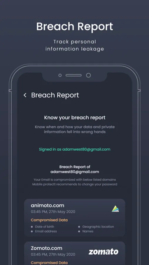 Scan your E-Mail across the globe to identify Mobile Apps or Websites that have leaked your E-Mail and sensitive information.
