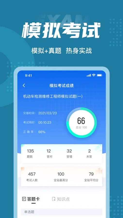 机动车检测维修工程师APP新增模拟考试功能,机动车检测维修工程师可按照自我练习的考点选择相对应的模拟试卷,也可选择搭配好的模拟整卷考试。
