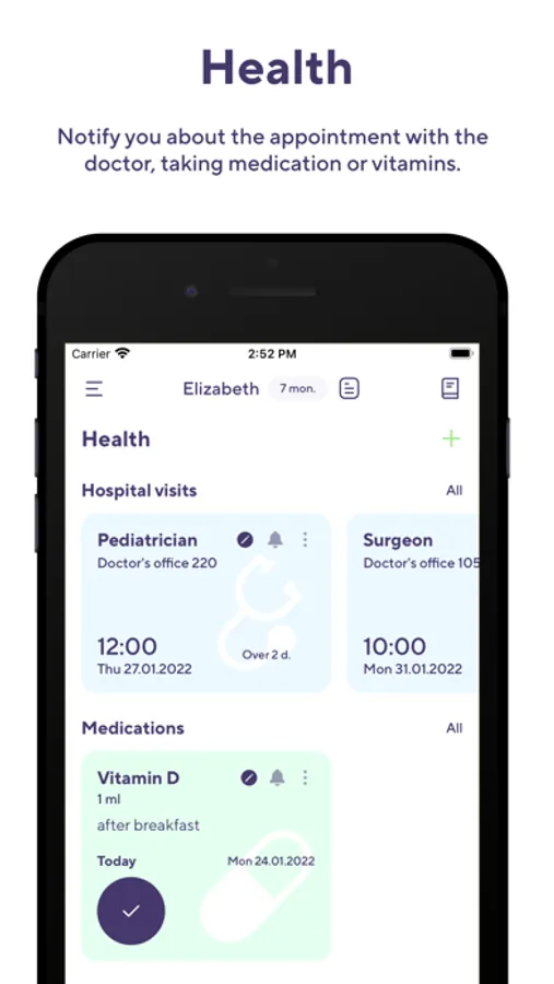* The app will remind you all the necessary information about your doctor's appointment when the time is right. Or it will remind you about the planned intake of the medicine with the required dosage. Or about vaccinations that need to be given to the baby.
