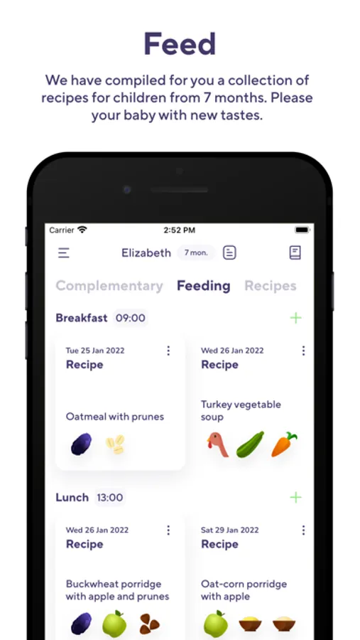 * Generate a checked list of products for your baby and build menus from them for your meals. Already introduced products for breakfast will be available to form the lunch menu. Be calm about your baby's reaction to lunch, because he will receive only proven products.