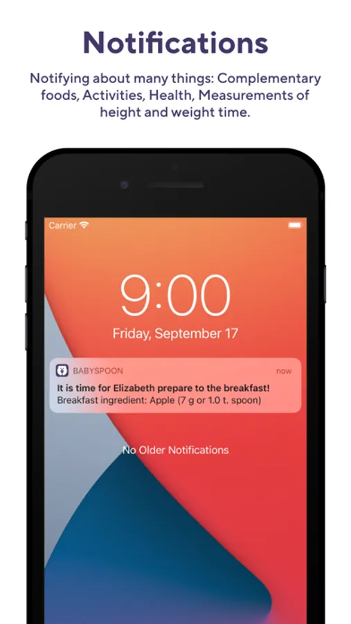 * Get information about the ingredients and their quantity in the form of notifications before breakfast and lunch. The app will remind you what food your baby is getting to know and what the recommended serving size should be.