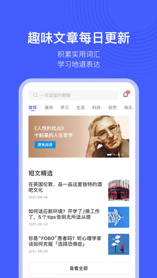精选短文:由编辑精心挑选的英语文章,只需三分钟,轻松积累实用词汇,学习地道鲜活表达;