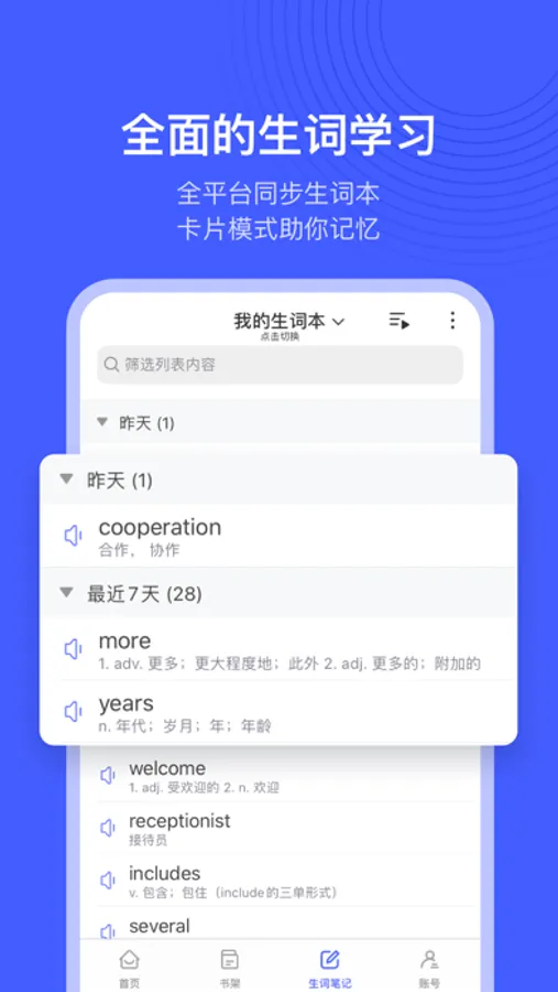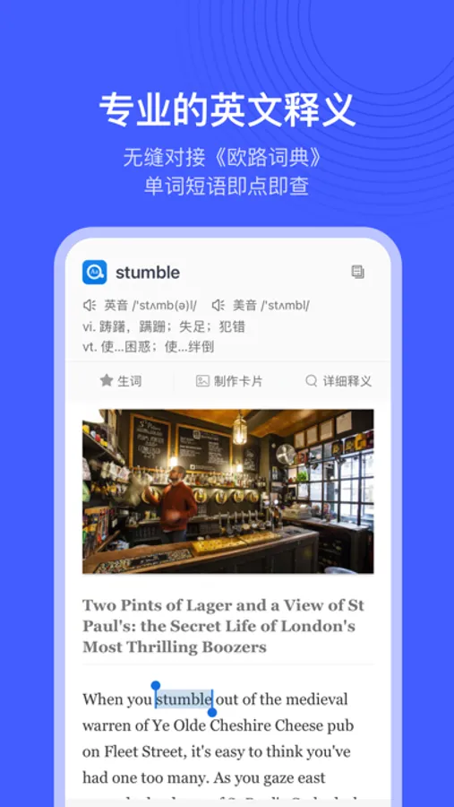 生词学习:文章中长按即可查词并加入生词本,更有卡片播放等复习模式助你学习;