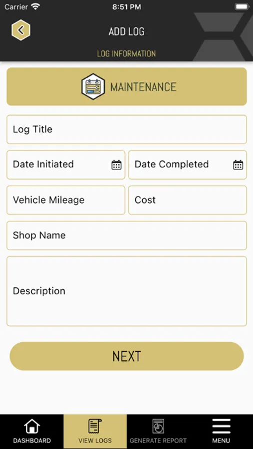 • Add Maintenance or Repair Logs (Includes option: Log Title, Dates, Milage, Cost, Shop Name, Description, Attach Receipt photos, Attache Repair Photos, Add Log