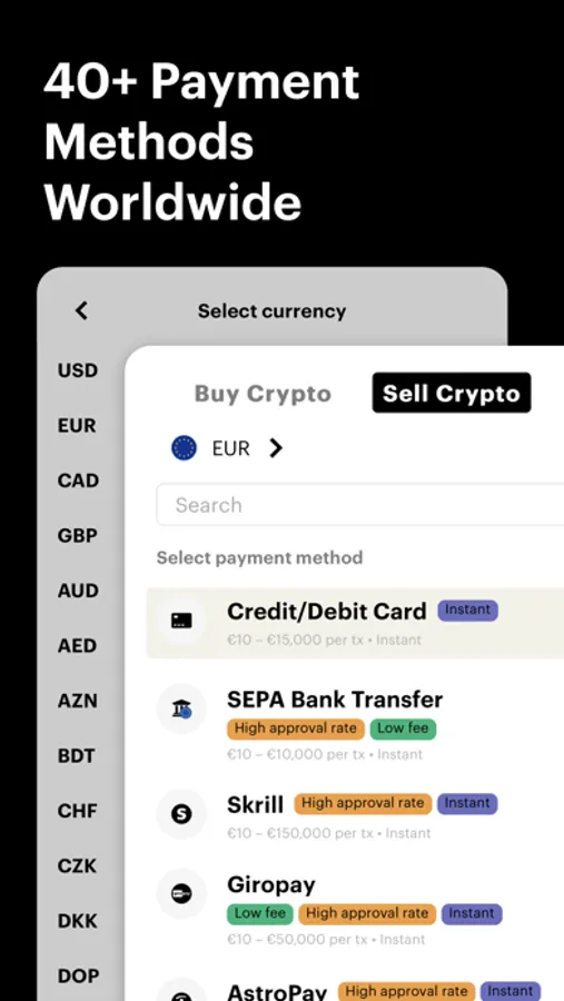 With an intuitive mobile interface, you can quickly buy crypto: Bitcoin (BTC), Ethereum (ETH), Tether (USDT), Binance Coin (BNB), Litecoin (LTC), Dogecoin (DOGE), Cardano (ADA), Polkadot (DOT), Tron (TRX), Bitcoin Cash (BCH), Polygon, VeChain (VET), EOS or any other supported digital asset.