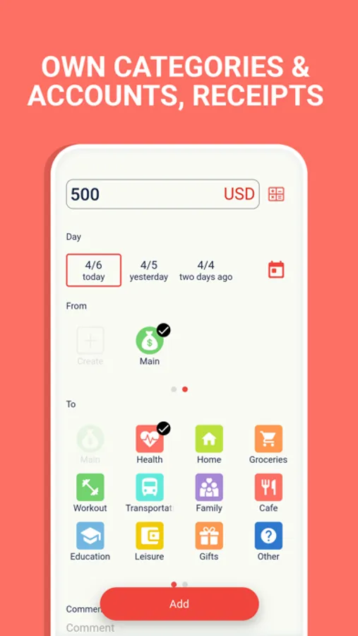 With an intuitive interface the process of adding expenses and revenue will be fast: fill in only key information with just a couple of taps, or add such further details as comments or photos of the receipt to the transaction.