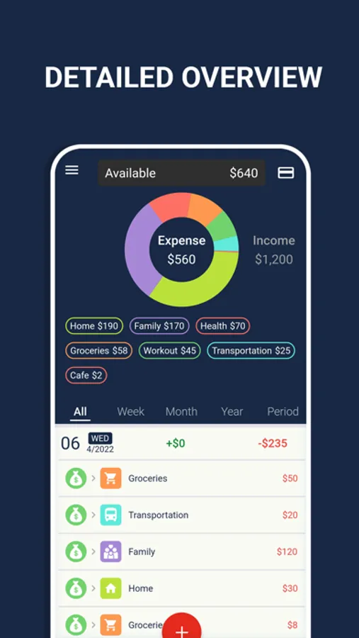 The app supports multiple currencies: you can add transactions in various currencies - for instance, when on vacation abroad, in case of income in a foreign currency or purchases in a different country. Built-in calculator will automatically update the exchange rate and make all necessary calculations.