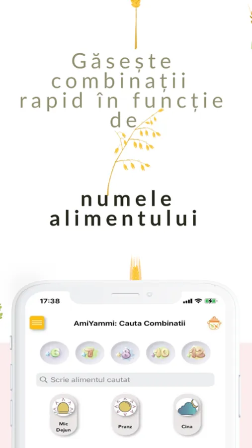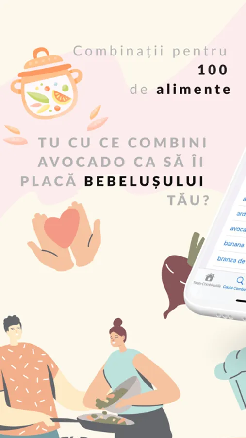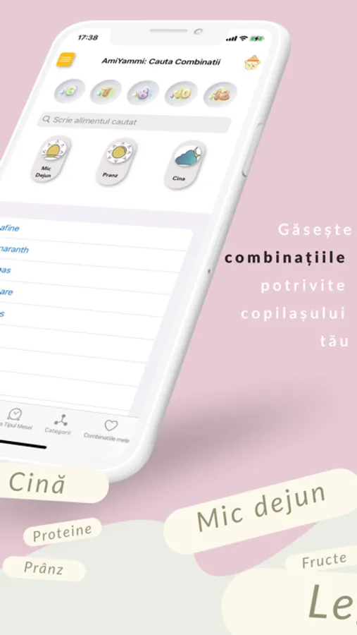 Noi iti oferim exemple de combinatii pentru 100 de alimente. Combinatiile sunt grupate dupa numele alimentelor, varsta copilasului, tipul mesei (mic dejun/pranz/cina) si categorii de alimente (legume/fructe/cereale/proteine/diverse).