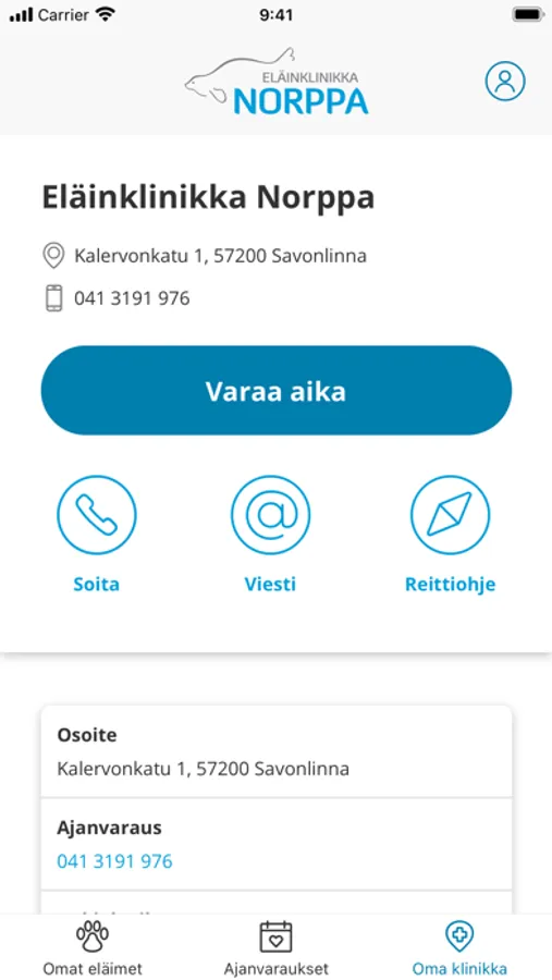 Eläinklinikka Norppa tarjoaa asiakkailleen mahdollisuuden katsella omien lemmikkien hoitotietoja sekä tehdä helposti ajanvarauksia Norppa-klinikalle. Voit esimerkiksi tarkistaa helposti rokotusten ajantasaisuuden, jatkohoito-ohjeet sekä laboratoriotulokset. Sovelluksella voit myös tallentaa omia eläinten hoitomuistiinpanoja sekä tallentaa lemmikkisi kuvan eläimen terveyskorttiin. Kirjautuminen tapahtuu potilastietokantaamme ilmoittamallasi puhelinnumerolla, johon lähetetään tekstiviestinä salasana sovellukseen kirjautumiseen.