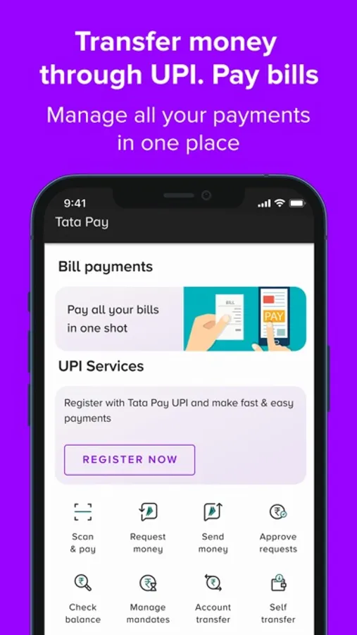 • Instant payments: Send money to a friend, family member or any of your contacts directly to their bank account from your bank account, using Tata Pay UPI