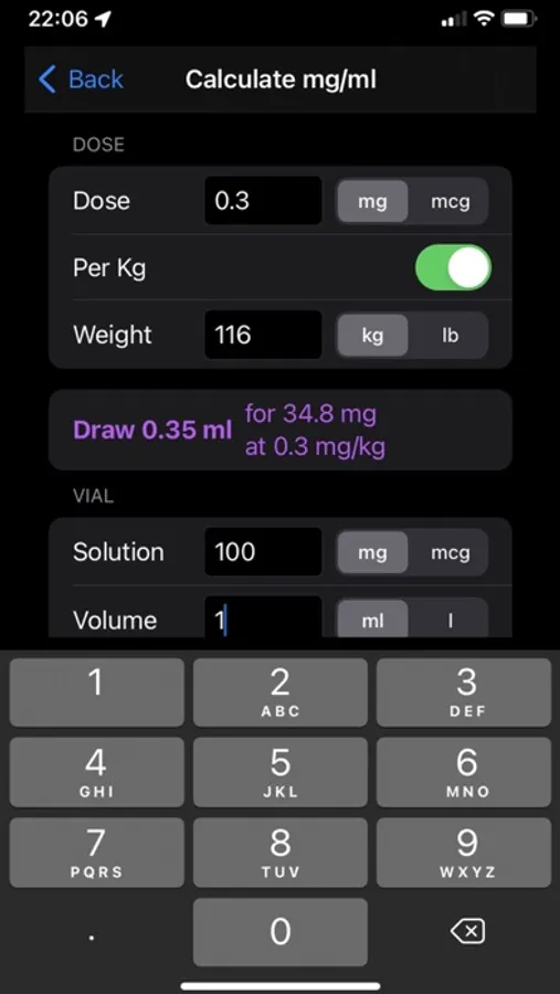 A calculator for nursing unit conversions. Quickly calculate now much to draw based on mg per kg patient weight and mg/ml of medicine.