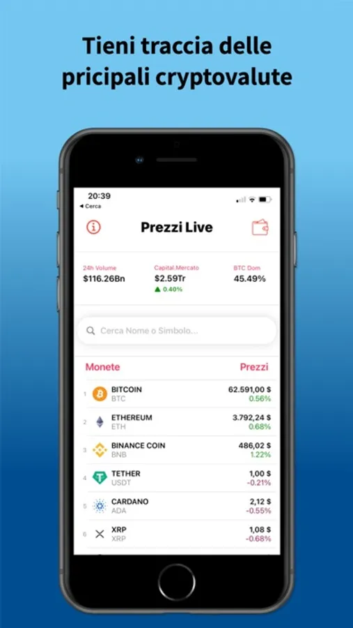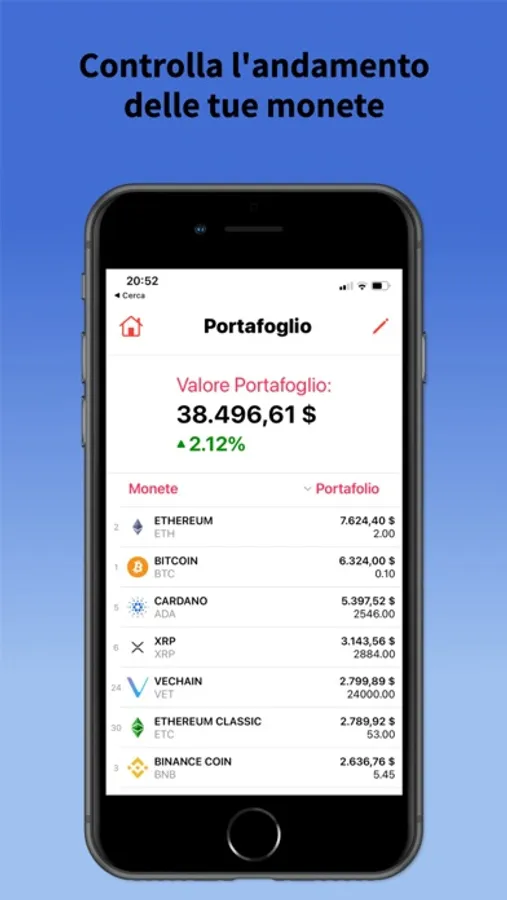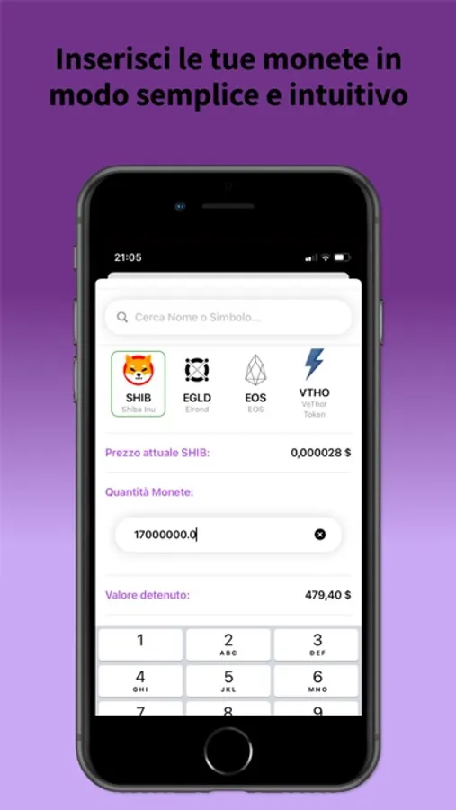 Inoltre è possibile inserire, in modo semplice e intuitivo, le proprie criptovalute così da avere sempre in primo piano il valore totale.