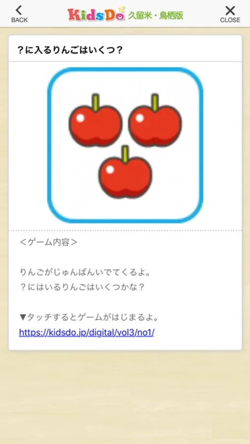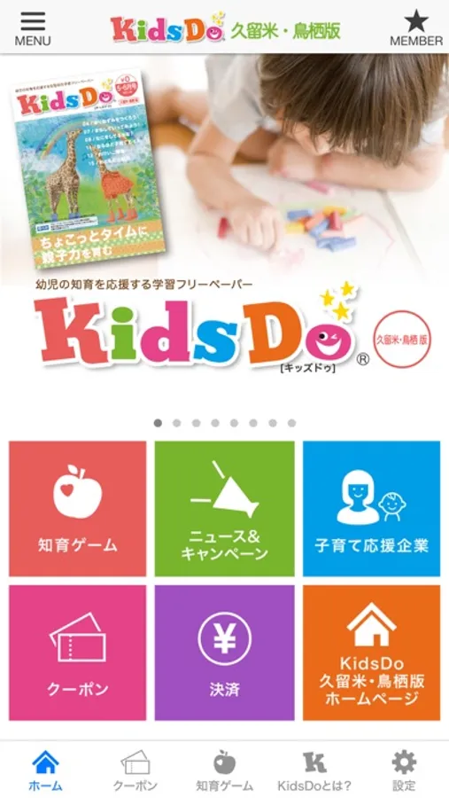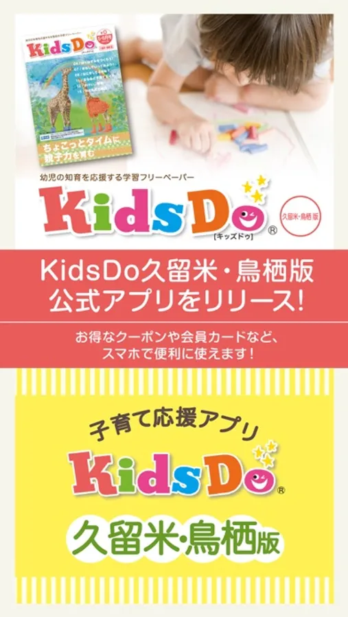 KidsDo(キッズドゥ)久留米・鳥栖版は、福岡県久留米市と佐賀県鳥栖市および周辺のお子様の知育や情操教育をサポートし、「ちょこっとタイムに親子力を育む」ことを応援する、地域密着型の子育て応援アプリです。