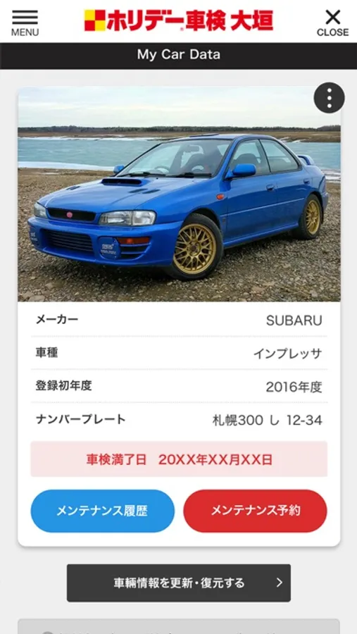 一度店舗へご来店いただきお車の登録がある場合、アプリに必要情報を入力していただくと、ご自身のお車の車検時期などがアプリ上でご確認いただけます!