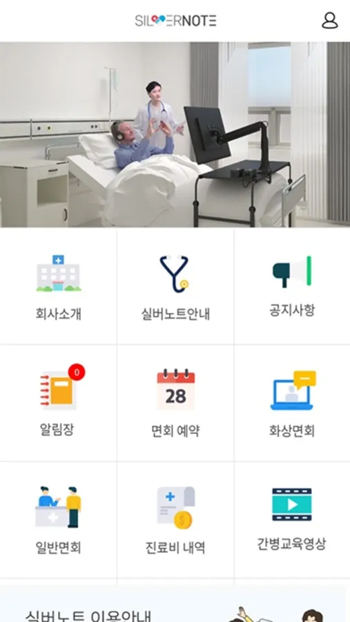 병원소개, 알림장, 간병교육영상, 앨범, 식단표, 사회복지프로그램, 각종치료 등의 카테고리 서비스를 제공함으로써 각종 시설(병원 및 요양원, 주간보호센터)에서는 홈페이지 역할을 통해 각종 정보를 제공할 수 있으며 보호자는 치료를 받고계시는 우리 부모님만의 정보만 스마트폰을 통해 각종 정보를 전달 받을 수 있는 신개념 어플리케이션 입니다.