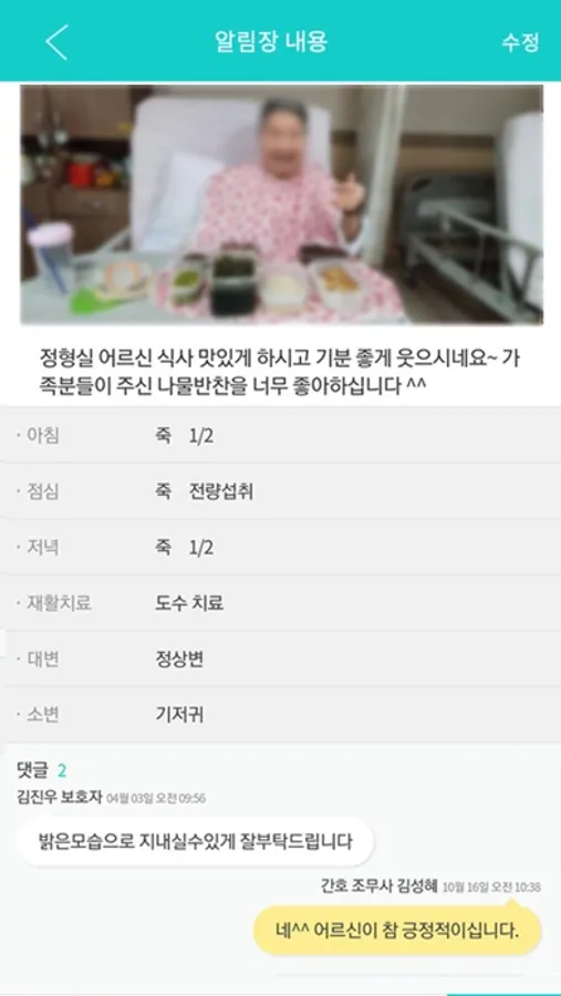 소속기관의 간병사 및 간호사가 환자의 일상상태를 살피고 하루동안 일어난 일을