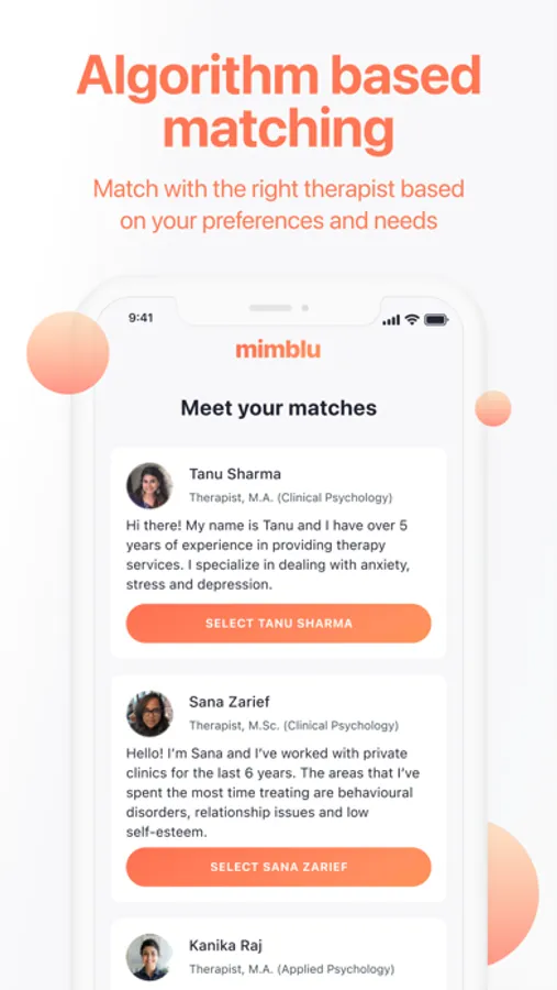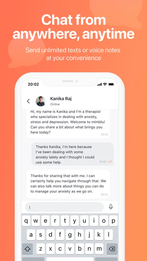 Mimblu allows for asynchronous text-based therapy with a qualified professional who provides support for your mental health journey. Share unlimited texts, journal or voice notes to communicate with your therapist and enhance your understanding of mental health and self-care. Our platform also offers live video sessions scheduled as per your convenience with your therapist.