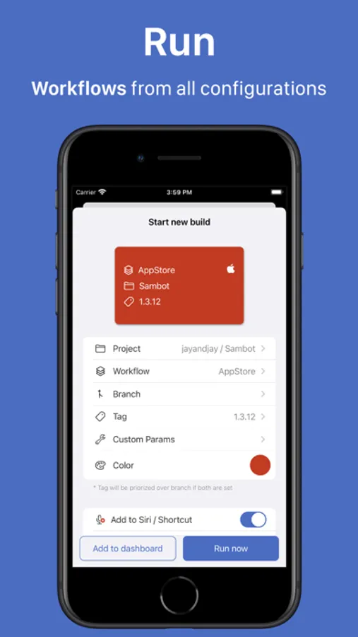 • Launch your favorites Workflows / Builds with Shortcut & Siri