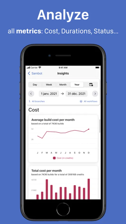• Analytics Insights of your projects with tons of metrics computed from all their builds: Cost, Duration, Success/Failure rates, Waiting time, Number of builds... These metrics are presented in beautiful colored charts, grids or highlights