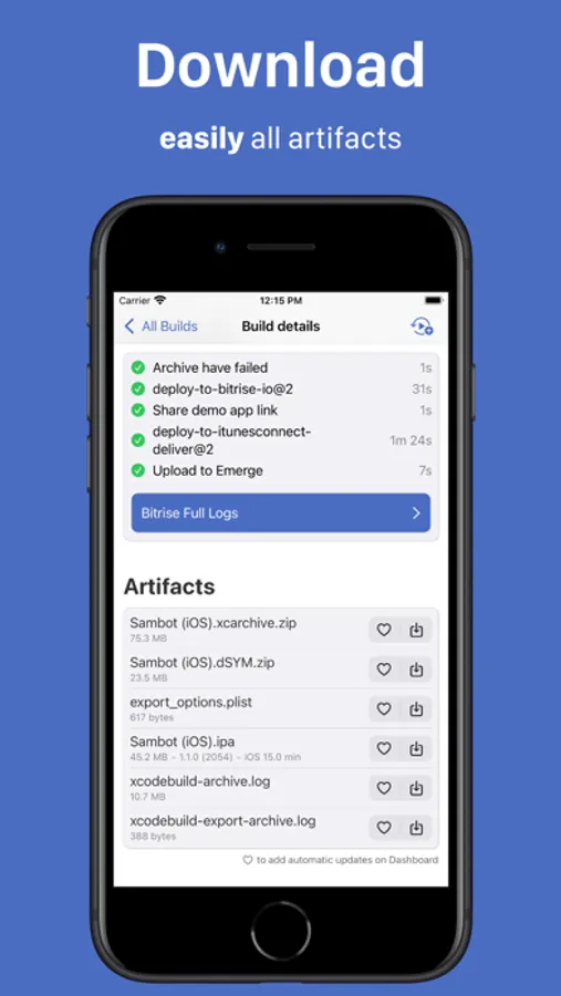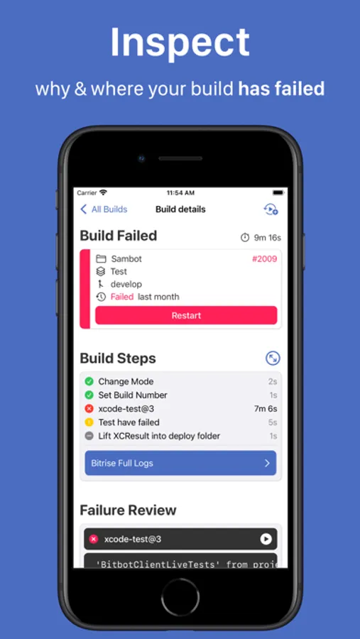 • Follow builds Steps (live or afterward) parsed from Bitrise log to instantly identify what's happening