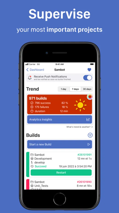 • See projects Statistics (success, failure & average duration) and projects Trends through a nice weather forecast representation