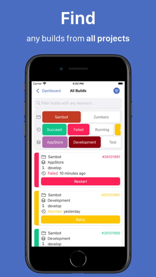 • Find the build you are looking for with a powerful search engine to inspect, rerun or abort it instantly