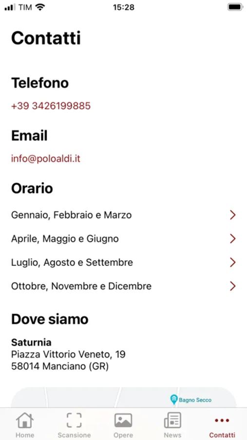 • Contatti: orario di apertura ordinario e aperture straordinarie, riferimenti per contatti diretti.