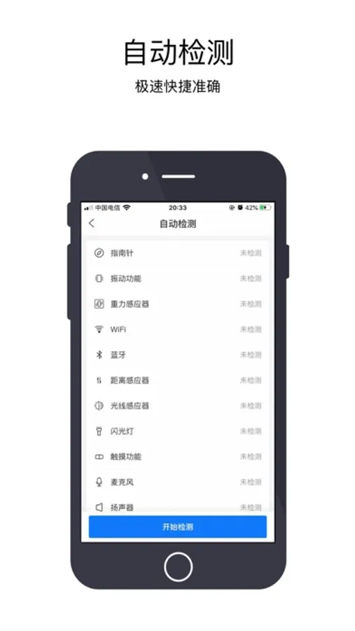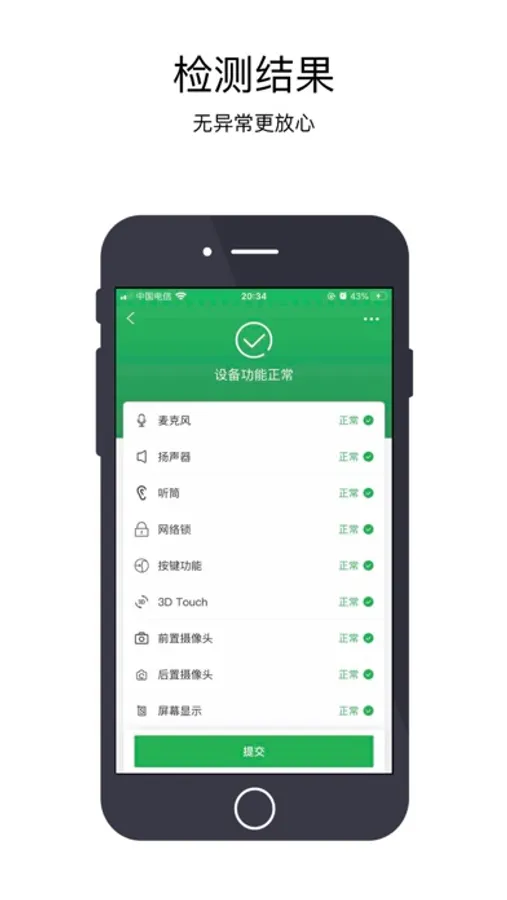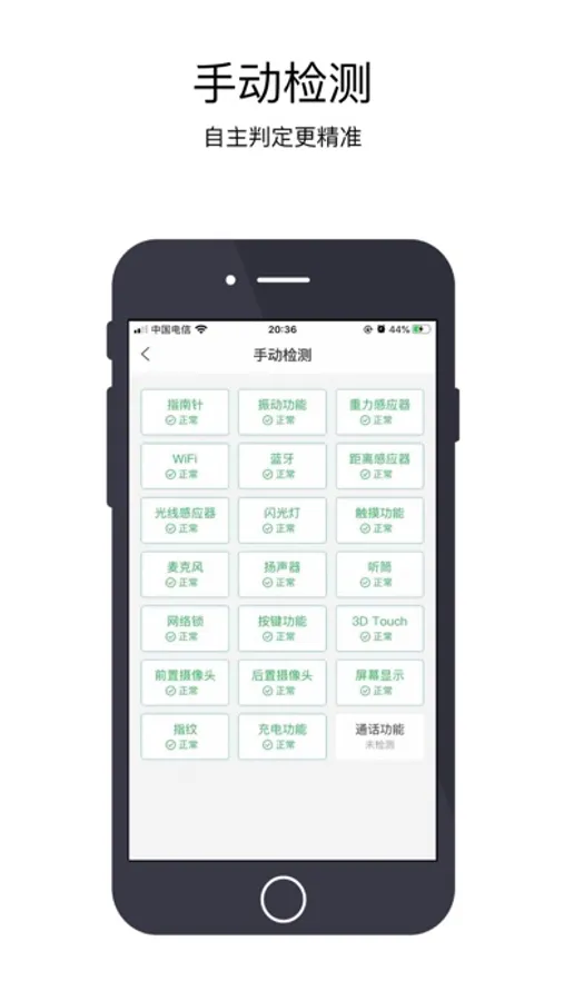 可检测指南针,振动,重力感应,WiFi,蓝牙,距离感应,光线感应,闪光灯,触摸功能,麦克风,扬声器,听筒,网络锁,按键功能,3D Touc功能,摄像头,屏幕显示,指纹面容,充电功能,通话功能等。