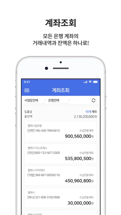 - 계좌조회 : 전체 사업장 계좌의 거래내역과 잔액을 조회하세요.