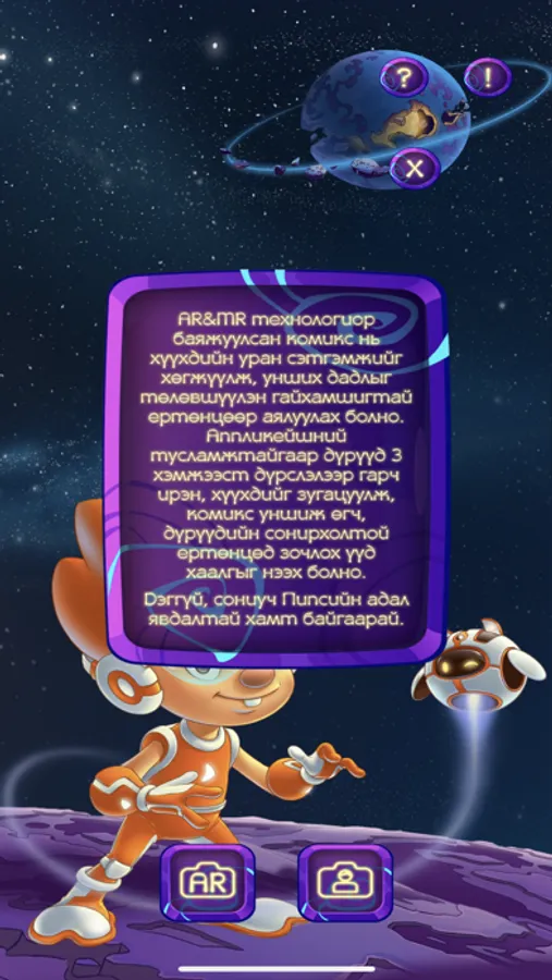 Номон доторх AR тэмдэглэгээтэй хуудас руу камераа чиглүүлж комиксоо сонсоно уу. Камераа эргүүлэн зурган хүрээнээс сонголтоо хийн зургаа дарж, чимэглэн хөгжилдөөрэй. MR цэс: Төрлүүдээс сонголтоо хийн аялаарай.