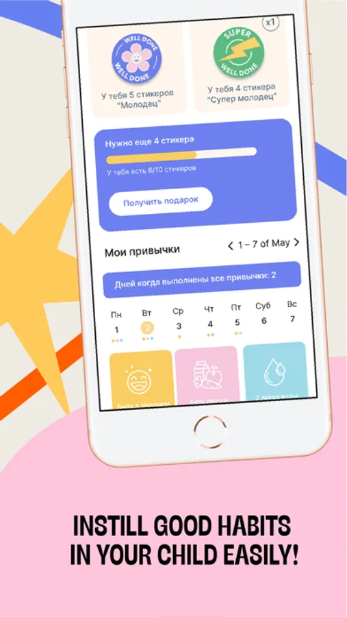 Child can set up three habits in the profile, mark them as complete every day and monitor statistics.