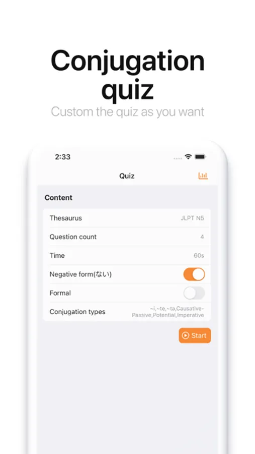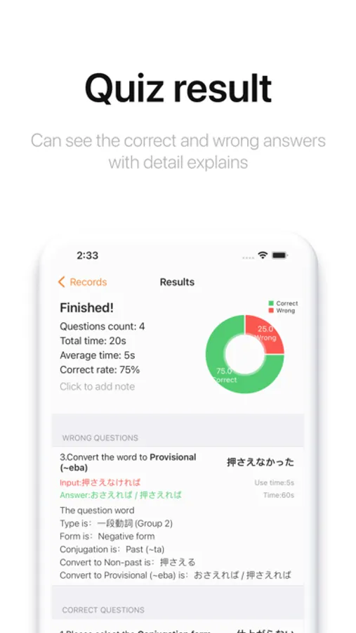 - Use custom quiz to consolidate the knowledge you have learned, and use multiple-choice or fill-in-the-blank questions to test with a variety of lexicons and conjugation types.