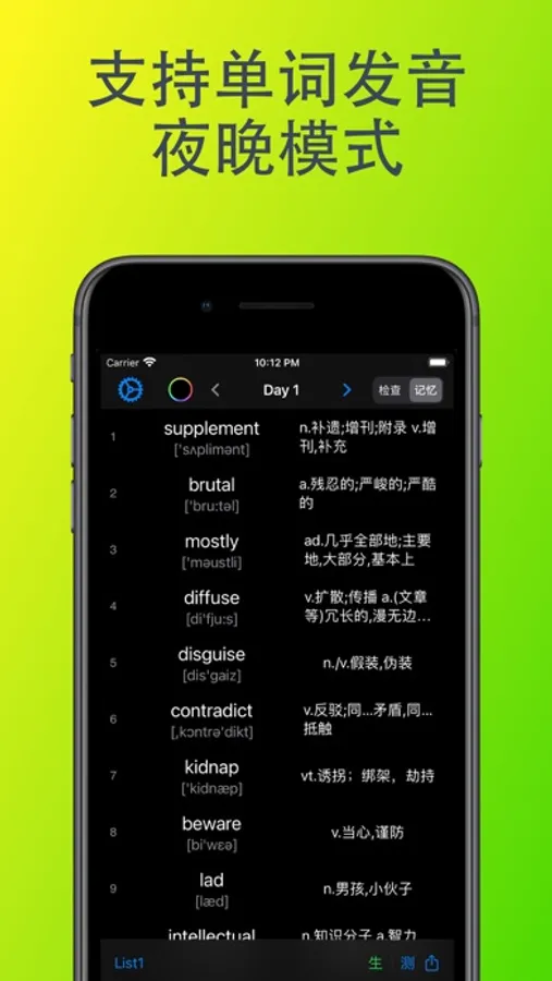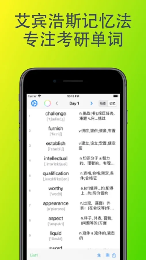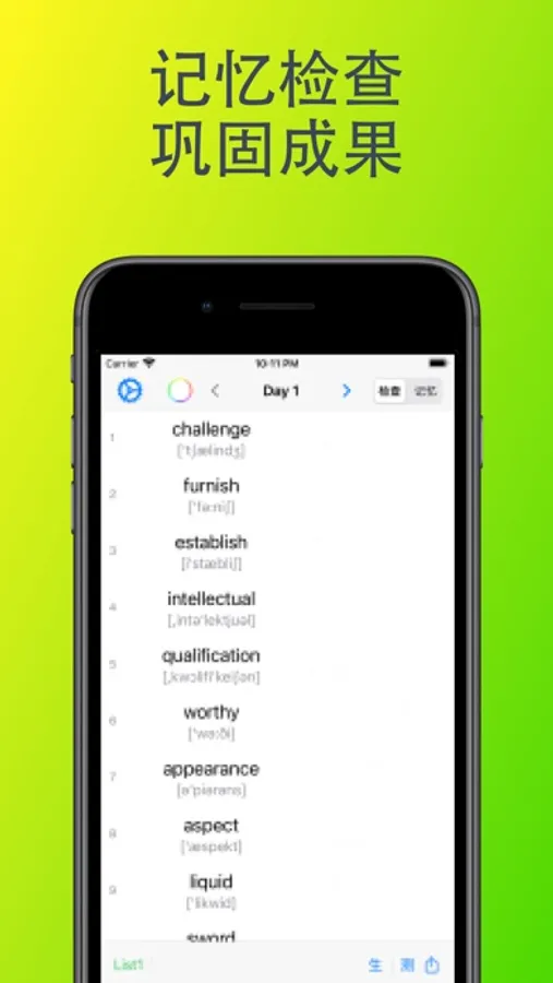 4 记忆检查:针对考研英语笔试不考听力的特点,重点检查看到英语单词,是否知道其中文意思的能力。实现快速记忆及检查,提升单词记忆速度。