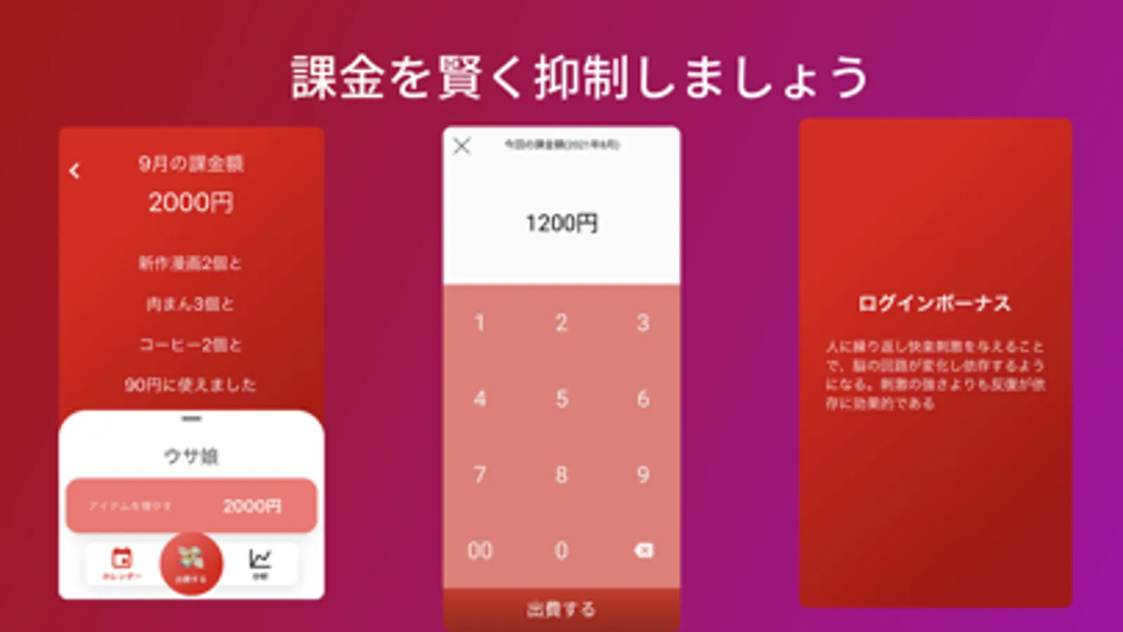 賢く課金と付き合うためのアプリです。単なる家計簿的な機能だけではなく、浪費を抑えるための工夫を用意しております。