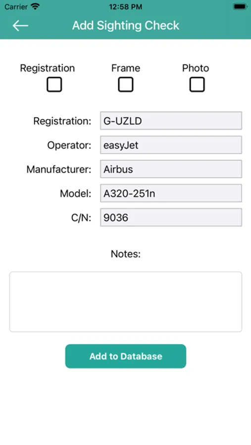 - Add Sightings. Great for when you are out spotting, insert the details of what aircraft you saw and have it added to your database in seconds. Anything you add in the App is then also automatically shown through the main web based database system, so no more need to upload anything when you get home.