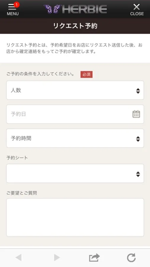 希望の人数・日時を指定して送信するだけで予約を依頼できます。