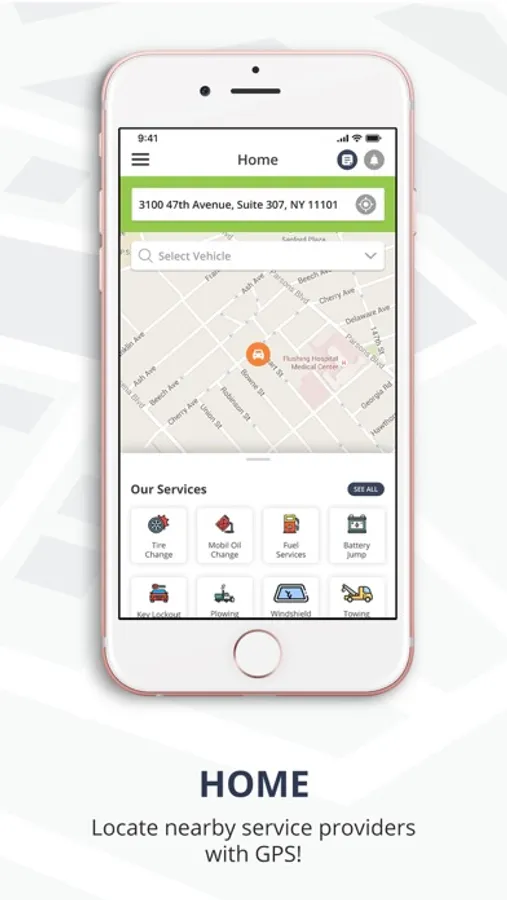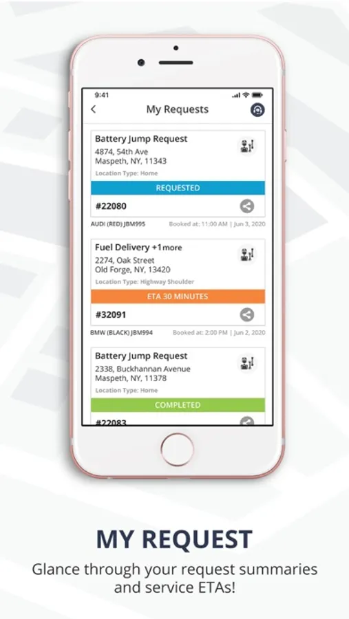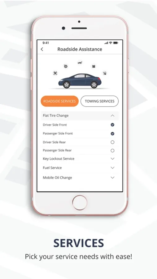 You can request assistance for Mechanical Issues, Battery Issues, Flat Tire Change, Fuel Service, Key Lock Out, Towing and a lot more!