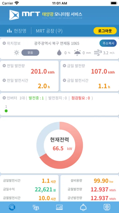 클라우드 태양광 모니터링은 언제 어디서든 클라우드 모니터링 서버에 접속하여 태양광 발전 현황 및 경보 알림을 받을 수 있는 애플리케이션입니다.
