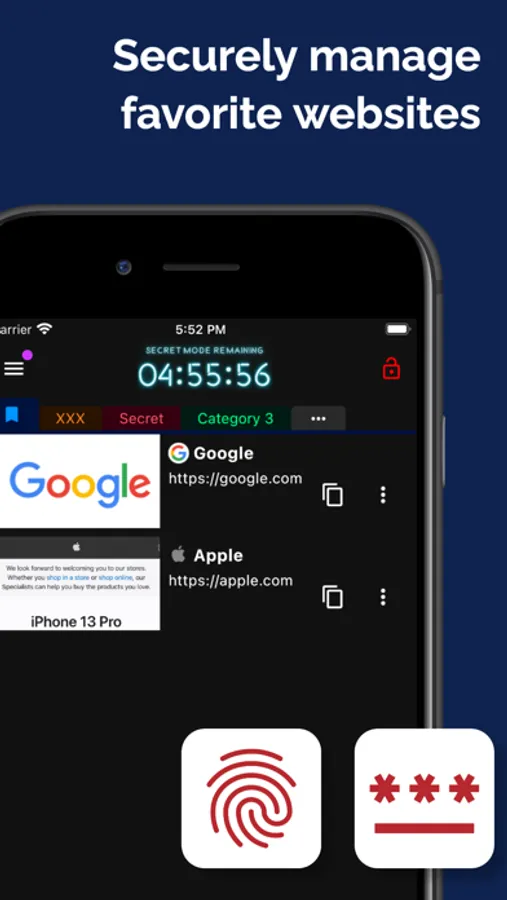 You can manage secret websites as secret bookmarks, separate from regular bookmarks that are available as soon as you open the app. Secret bookmarks are only displayed when you unlock the passcode lock or successfully pass biometric authentication, so you can rest assured!