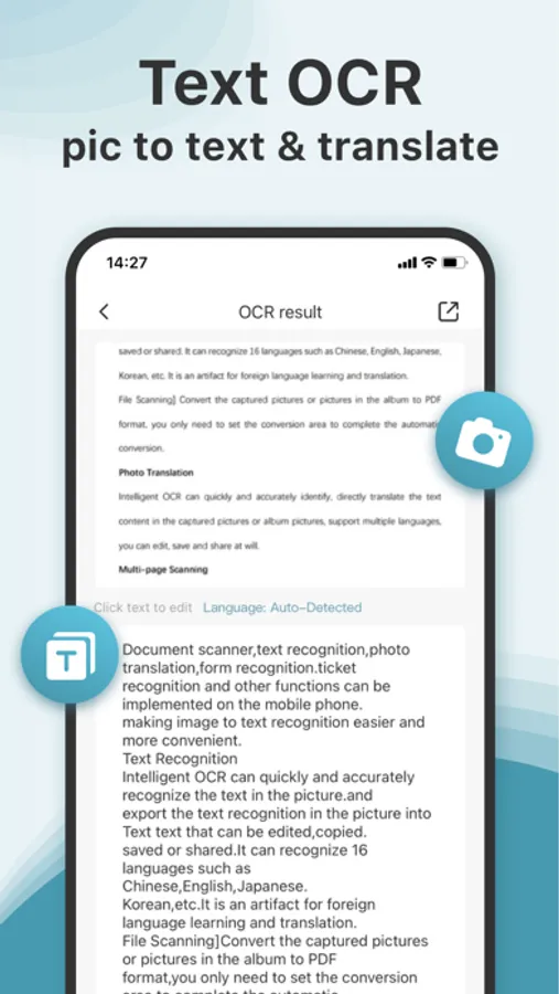 ● Flexible selection, recognition and translation results can be edited and copied to various apps for use.