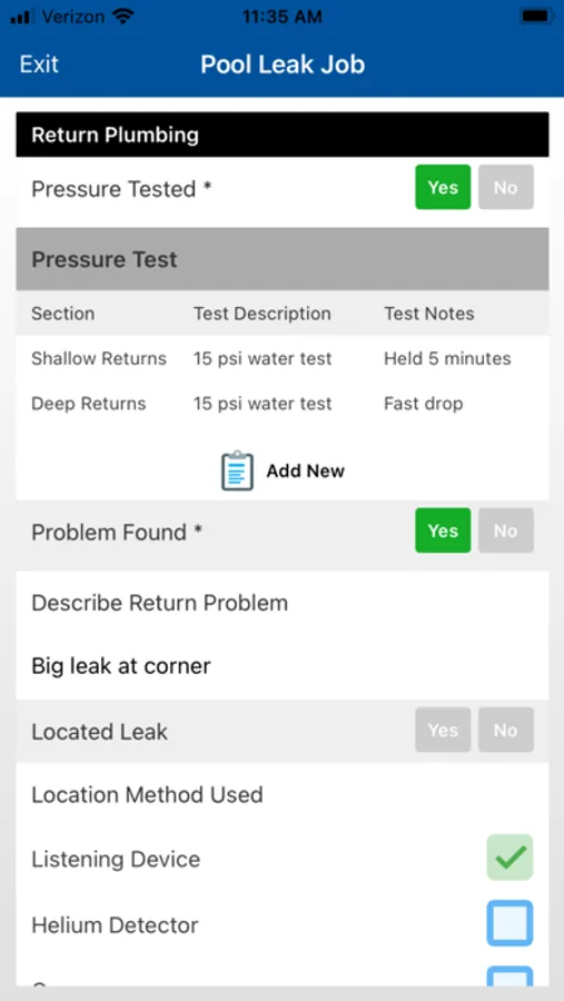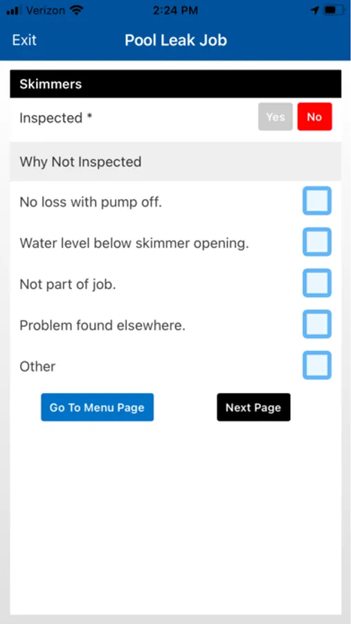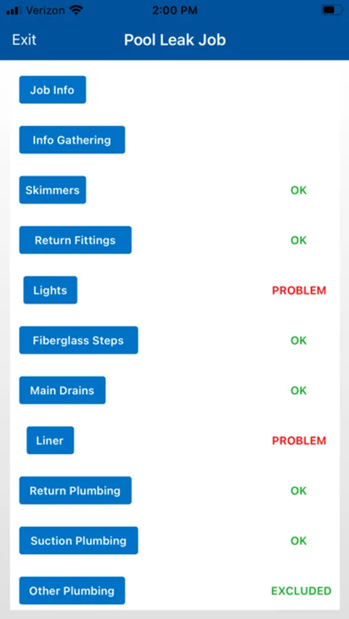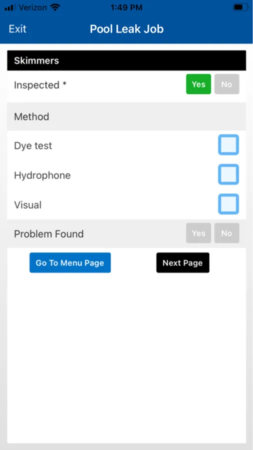 The mobile data collection portion of the app encourages the leak technician user to follow a best practices procedure at the job site. The app’s Menu Page monitors and displays your progress through a comprehensive inspection of the pool. A dynamic display of fields based on previous entries and multiple-choice questions minimizes data entry.