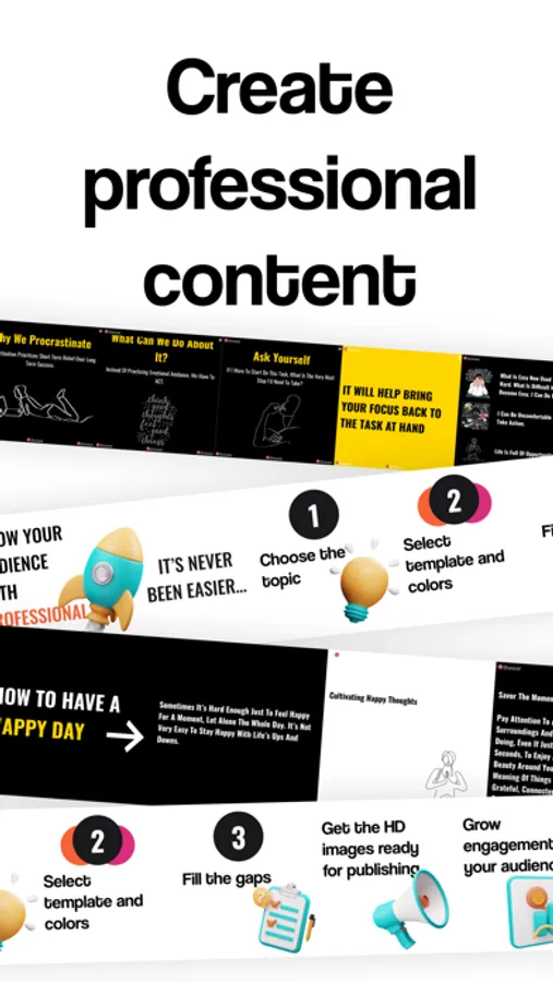 Our app solves the problem of time-consuming and challenging carousel creation. No more wasting hours trying to create the perfect post. With our templates and AI-generated carousels, you can create stunning Instagram posts in just a few minutes. This will give you more time to focus on creating engaging content and growing your Instagram following.