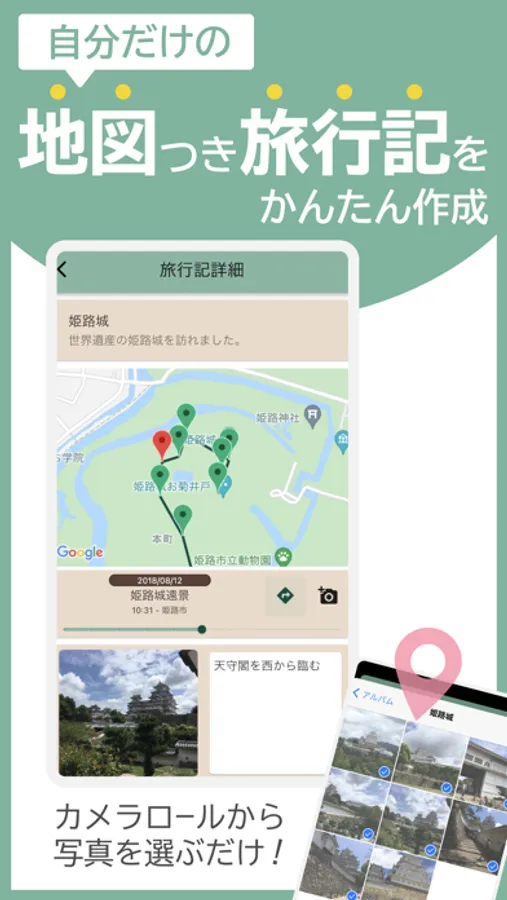 カメラロールの写真を選択するだけで、簡単に地図つき写真アルバムを作成できます。たくさん文章を入力する必要はありません。
