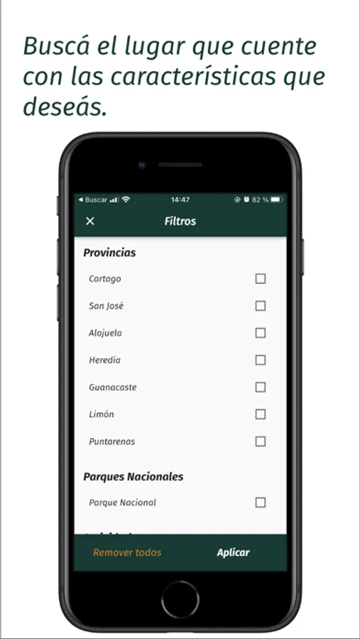 Through our filters you can find the places that suit your needs easily and quickly in the 7 provinces of our country: Cartago, Alajuela, San José, Limón, Guanacaste, Heredia and Puntarenas.