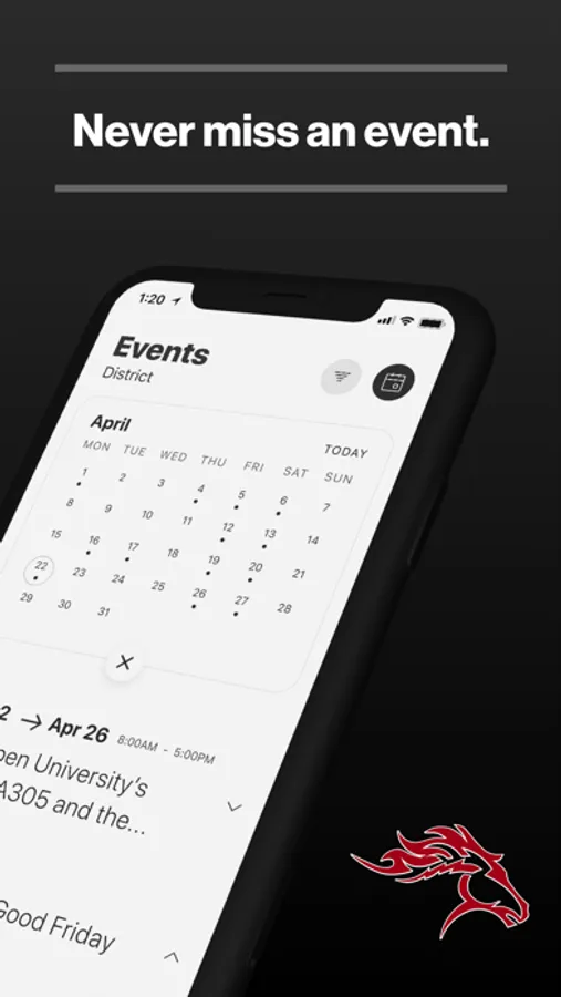 The event section shows a list of events throughout the district. Users can add an event to your calendar to share the event with friends and family with one tap.