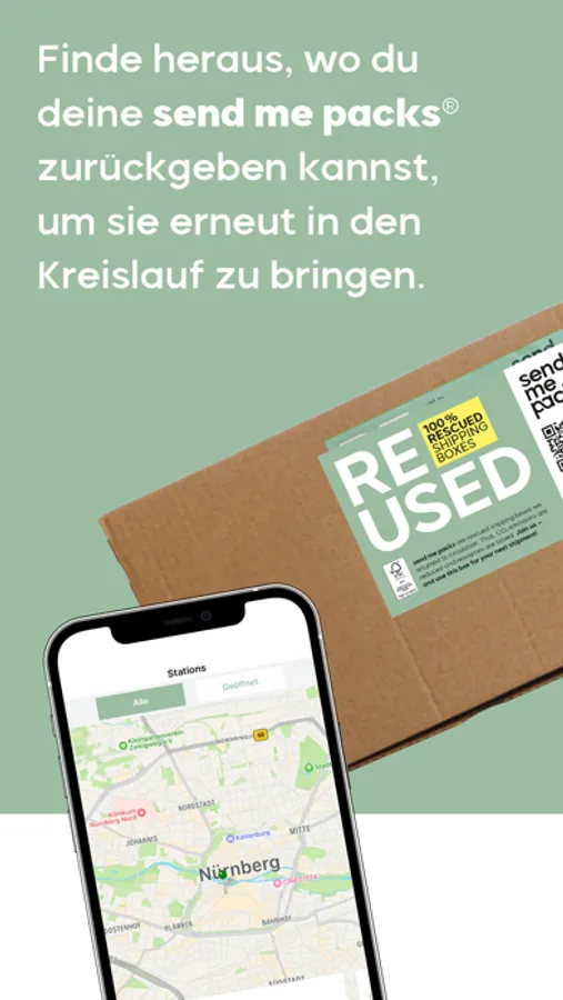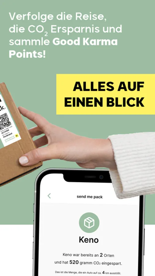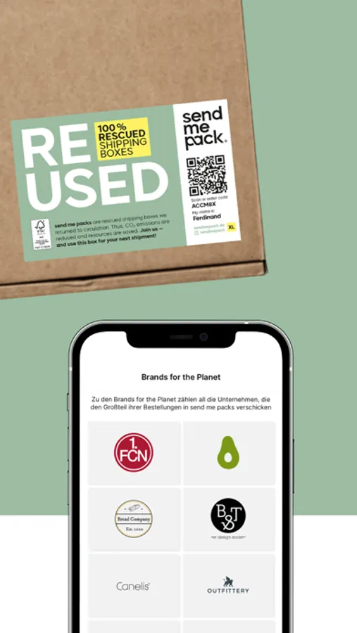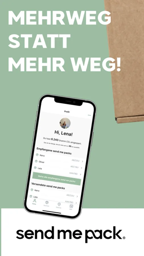 Die send me pack App gibt dir nicht nur einen Überblick darüber, welche Onlineshops & Brands unsere nachhaltigen Versandverpackungen bereits nutzen, sondern sie bietet dir ebenso die Möglichkeit, aktiv mitzumachen und deine erhaltenen send me packs per QR-Code einzuchecken, um Informationen wie den dadurch eingesparten CO₂-Wert, die Anzahl an Kartons, die eingespart werden konnten und die Rückgabestationen für unsere send me packs zu erhalten.